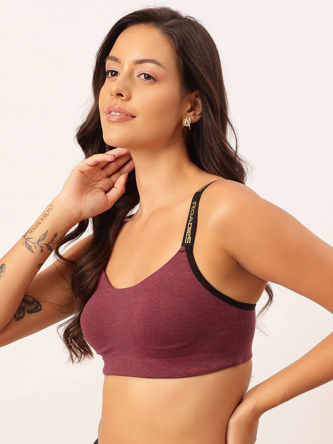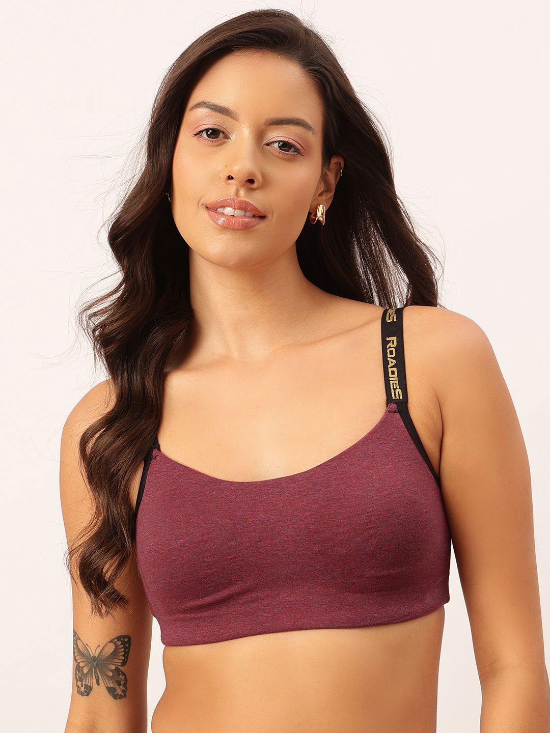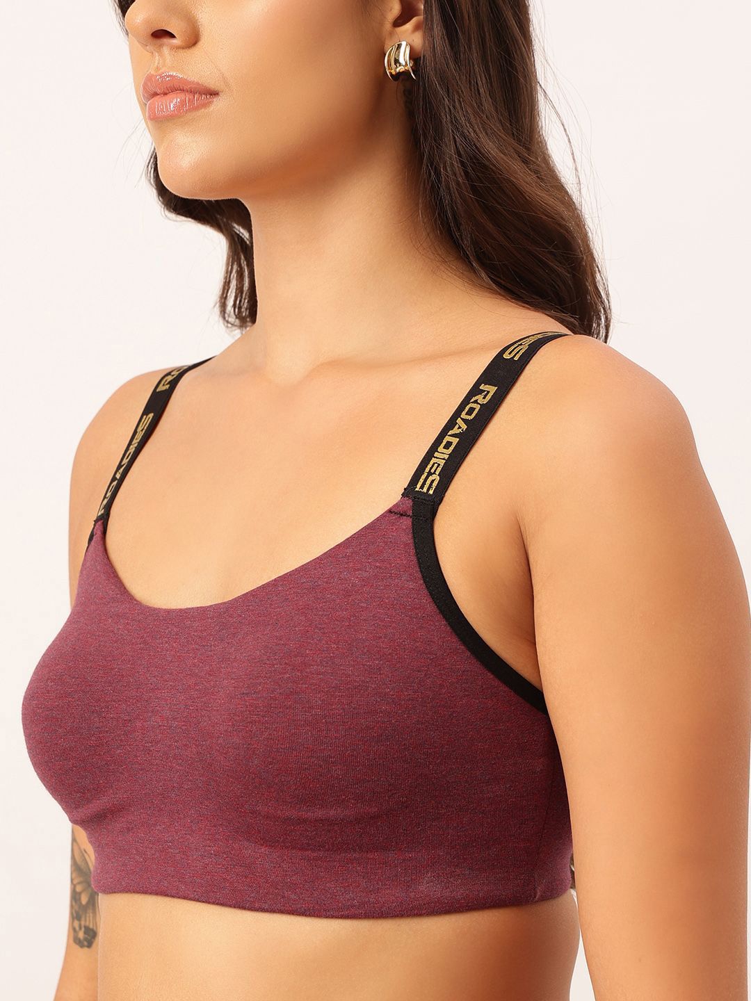 This maroon everyday bra is designed to deliver comfort with style. It features lightly padded, non-wired seamless cups for a smooth silhouette and gentle support. The slip-on closure and shoulder strap neckline make it easy to wear, while the breathable cotton-spandex fabric ensures all-day comfort—perfect for training, gym, or everyday use.