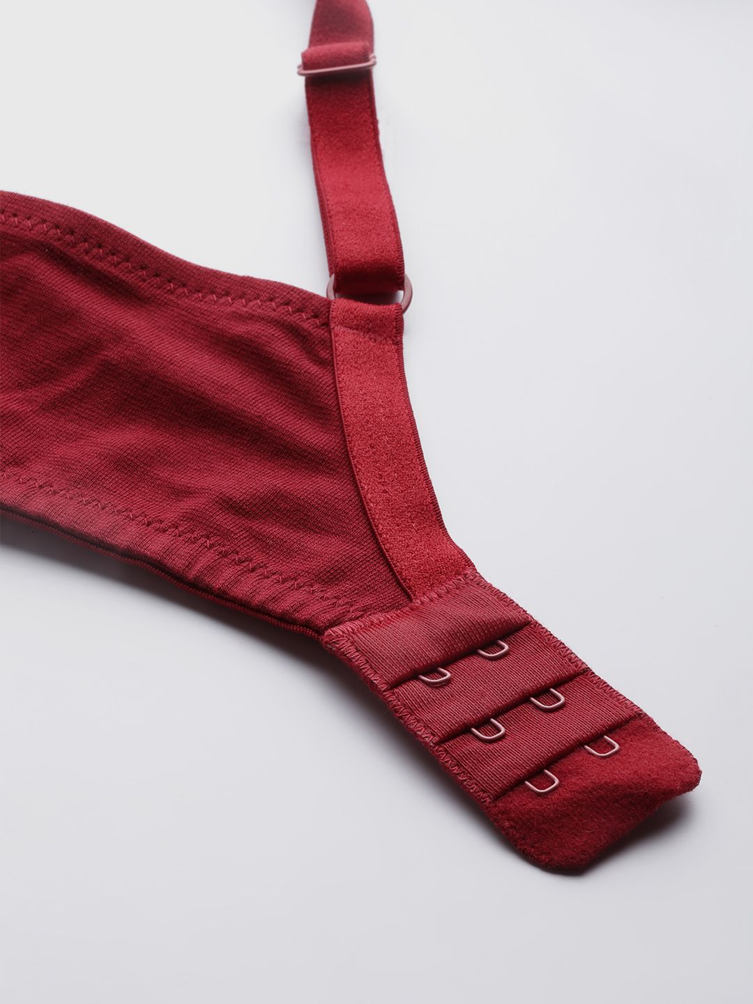 This maroon bra offers medium coverage with seamless, non-padded, and non-wired cups for everyday ease. Crafted from soft cotton with added stretch, it ensures breathable comfort and a smooth fit under tops, kurtas, or shirts. The adjustable straps and secure back closure provide all-day support without compromise.