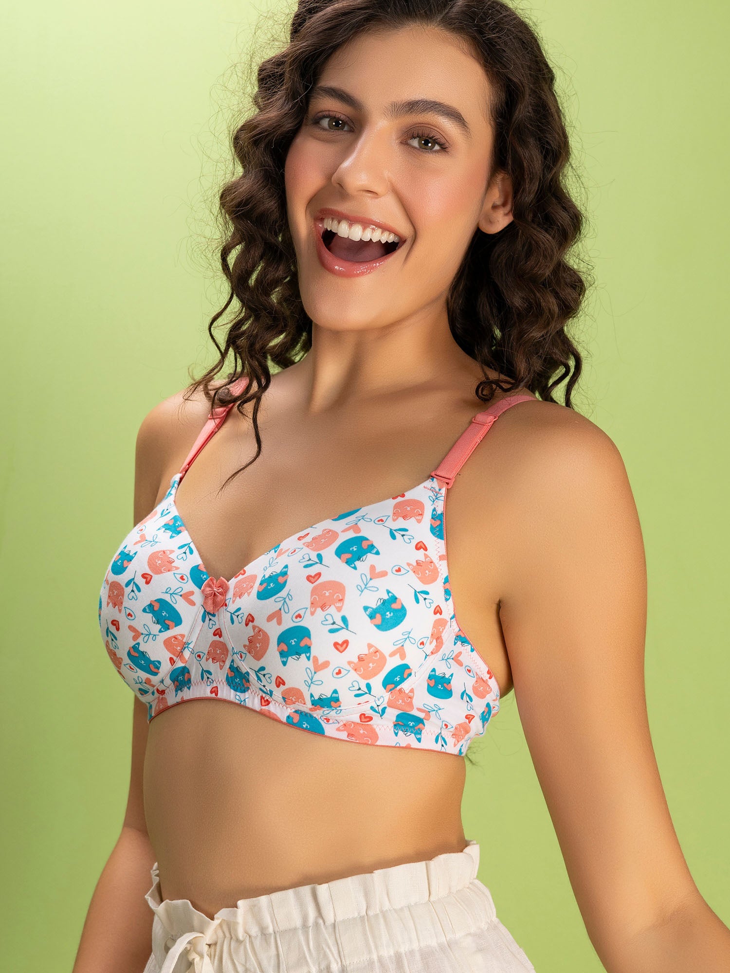 Stay comfy and cute with this padded, non-wired T-shirt bra designed for smooth daily support. The full-cup shape offers secure coverage, while the fun cartoon print adds a playful vibe. A sweet center bow brings in a touch of charm. The straight-back design includes detachable, multiway straps so you can style it your way, from classic to cross-back to halter. Finished with a double hook-and-eye closure for a snug, easy fit.