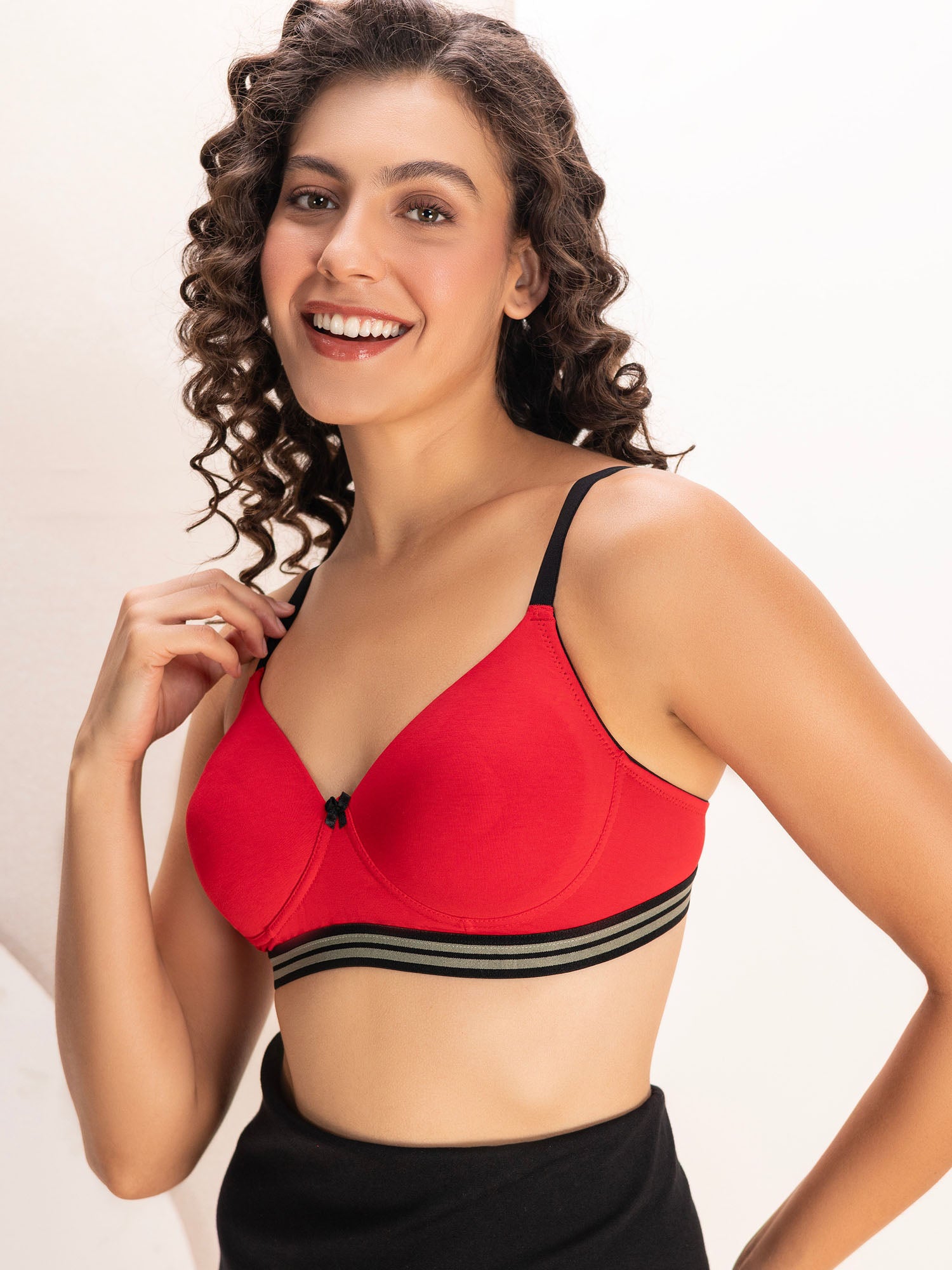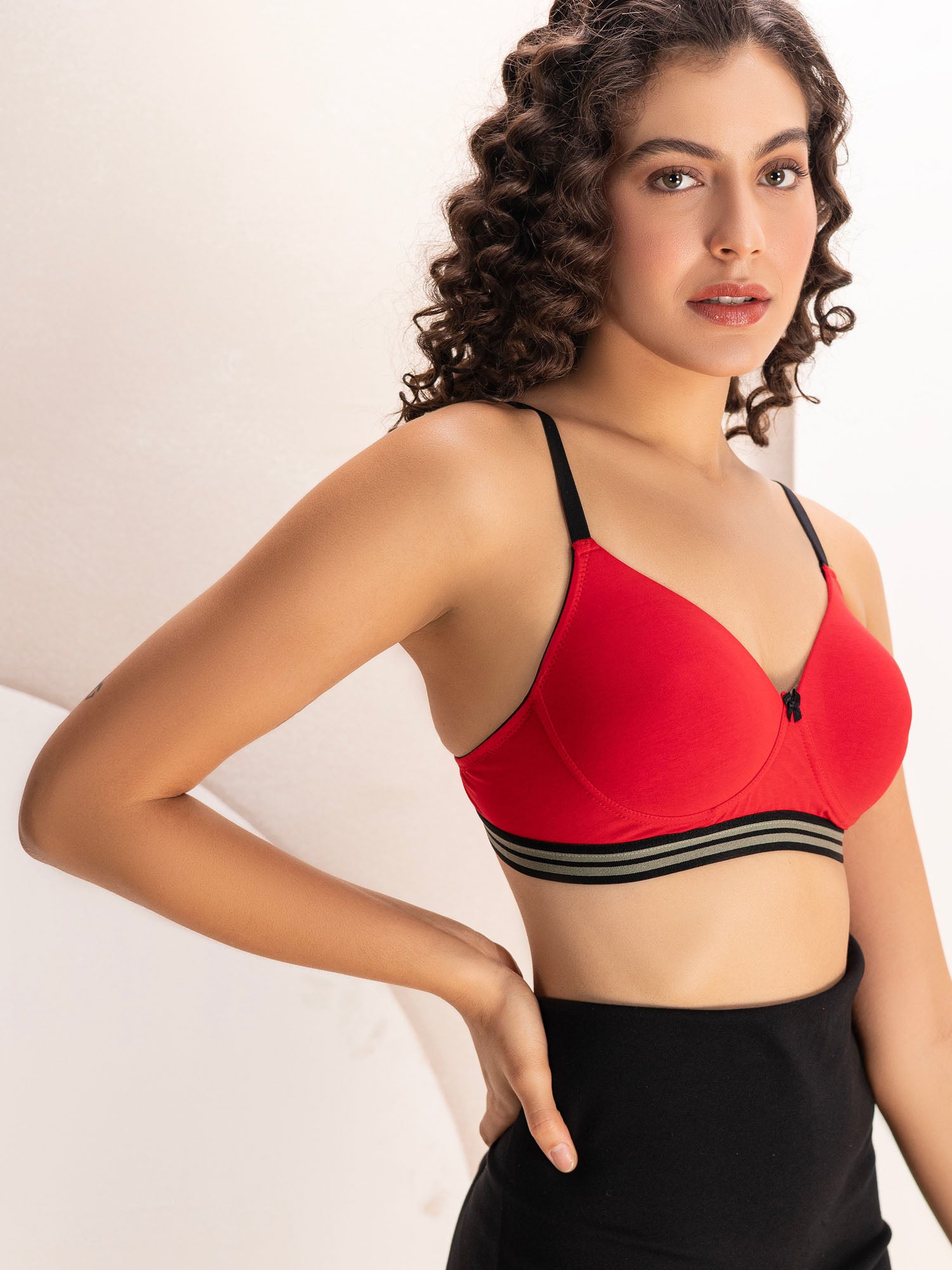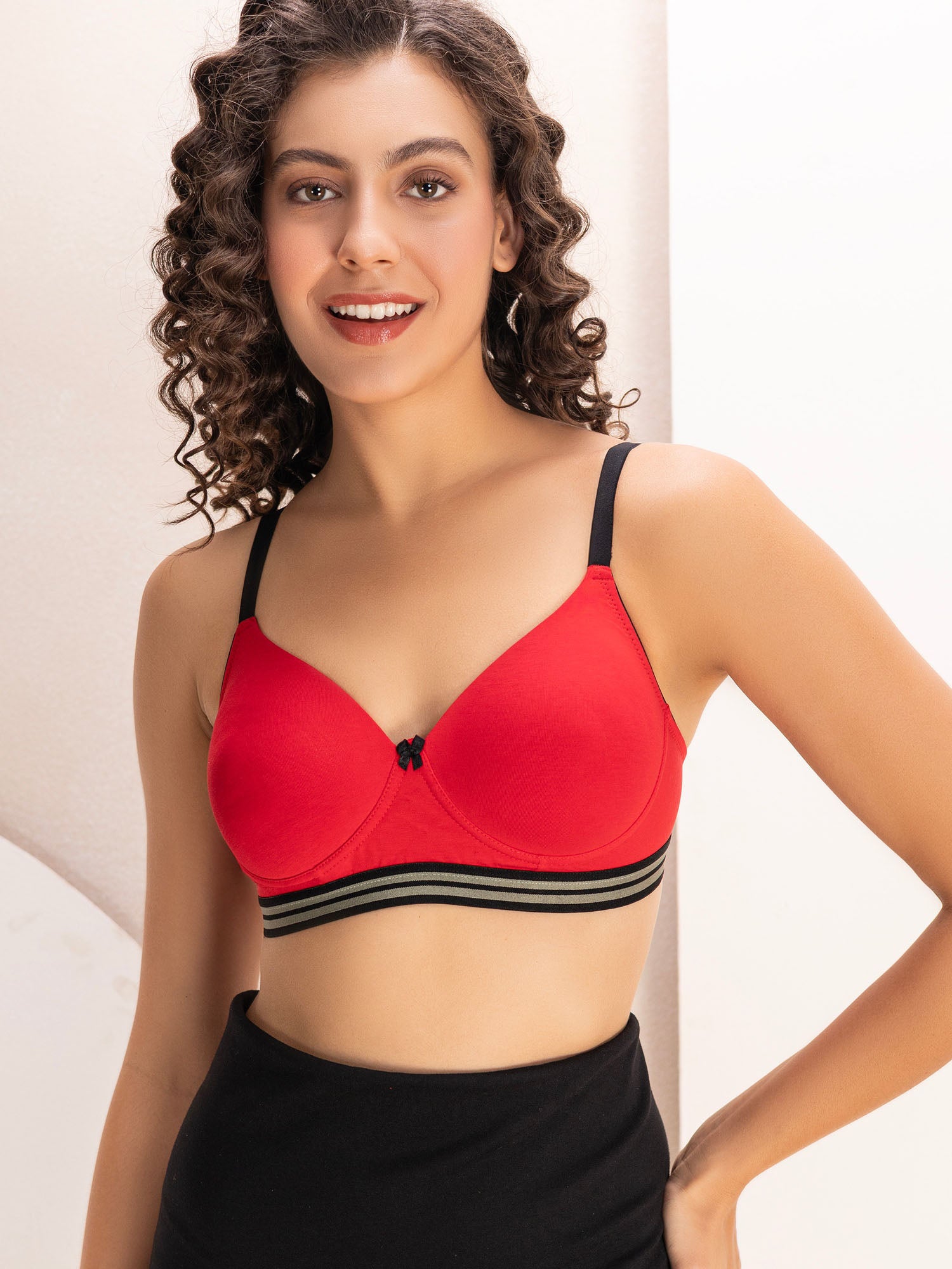 Padded, non-wired bra blends comfort with a sporty vibe. Crafted in soft cotton spandex fabric, it offers breathable stretch for everyday ease. The dual-finish self broad waistband elastic adds a stylish, athletic edge while keeping the fit secure. Adjustable straps let you customize your support, and a sweet center bow brings a subtle feminine touch. Finished with a straight-back design and a double hook-and-eye closure for a steady, reliable fit.