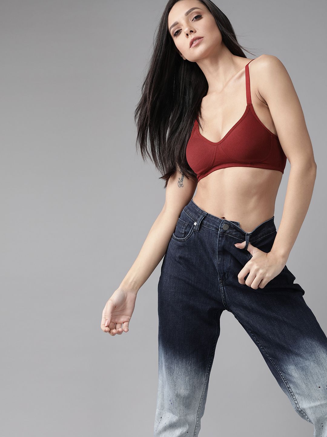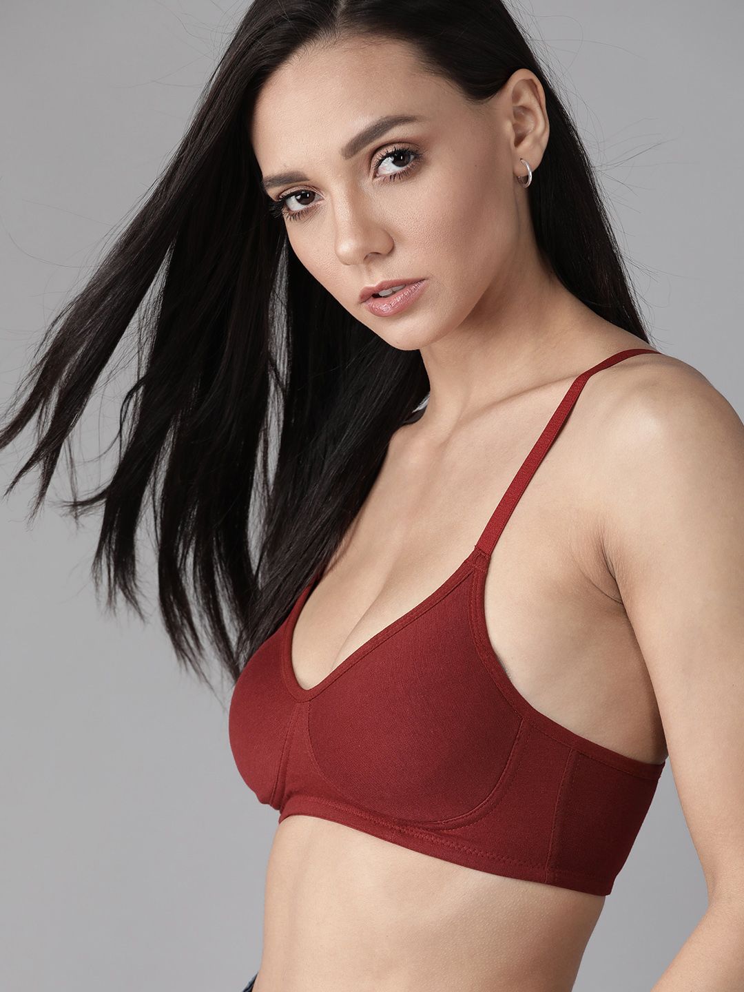 This maroon bra offers medium coverage with seamless, non-padded and non-wired cups for all-day ease. Made with soft cotton and stretchable spandex, it's designed for a smooth fit and breathable comfort under everyday outfits.
