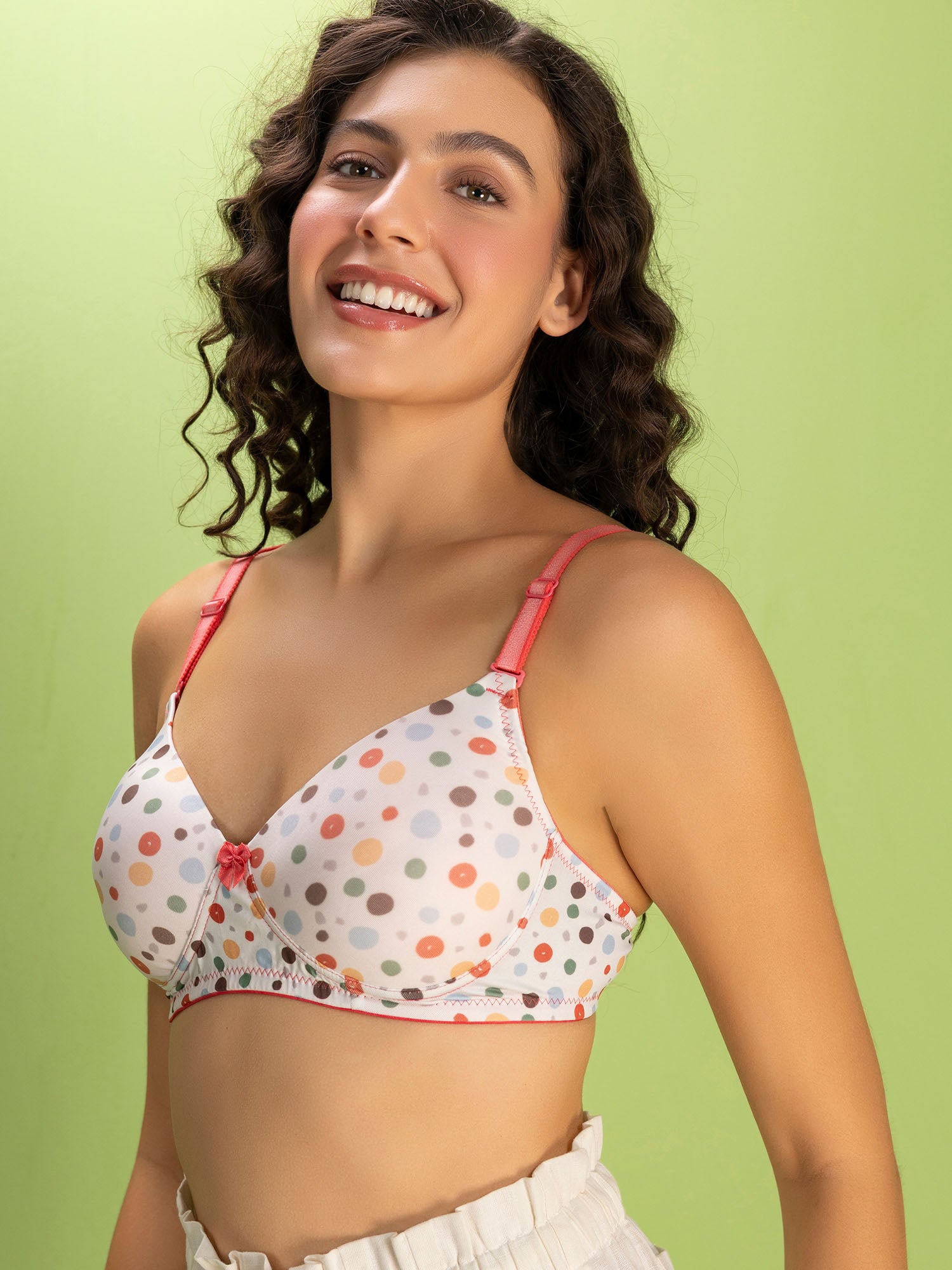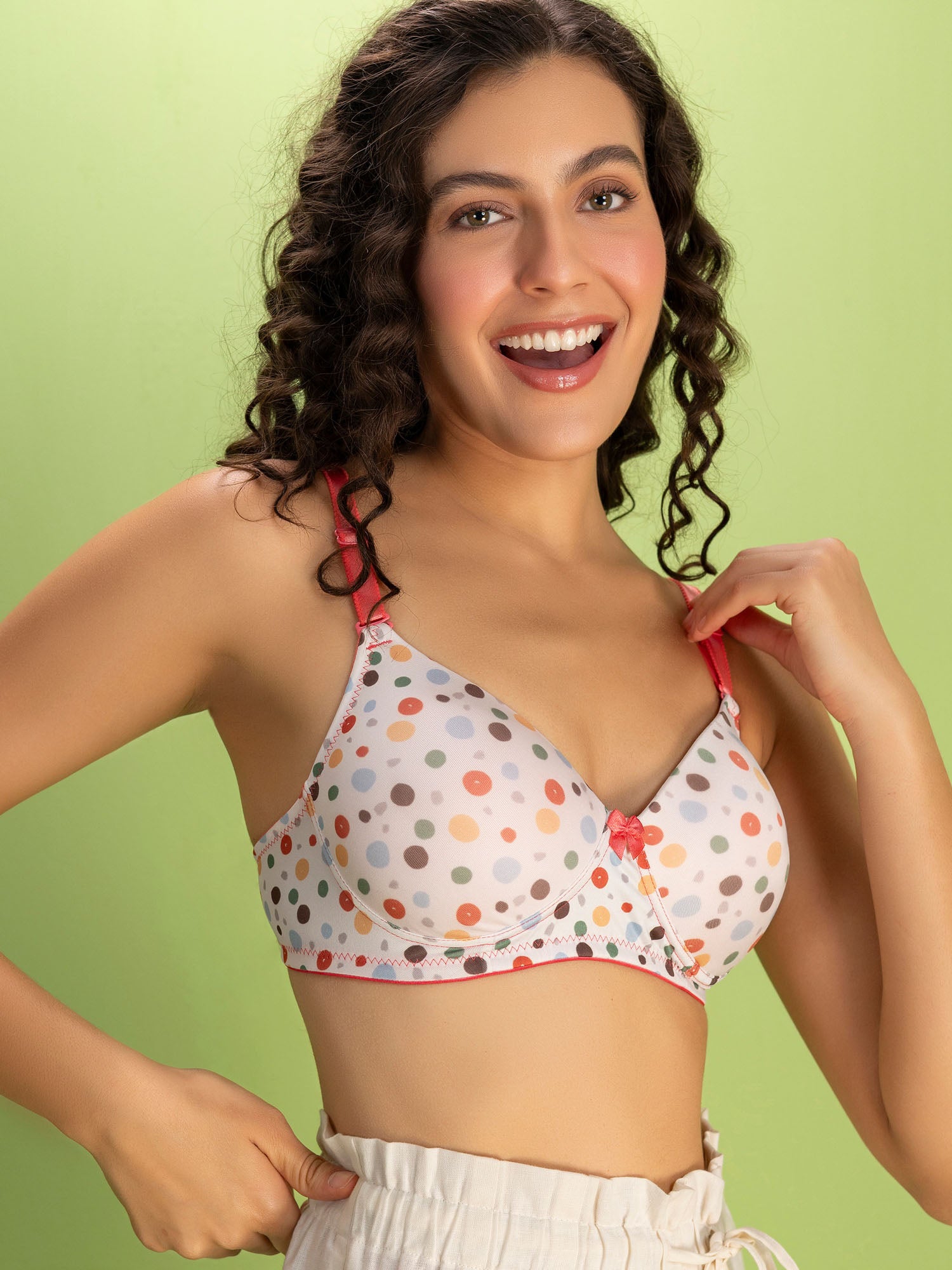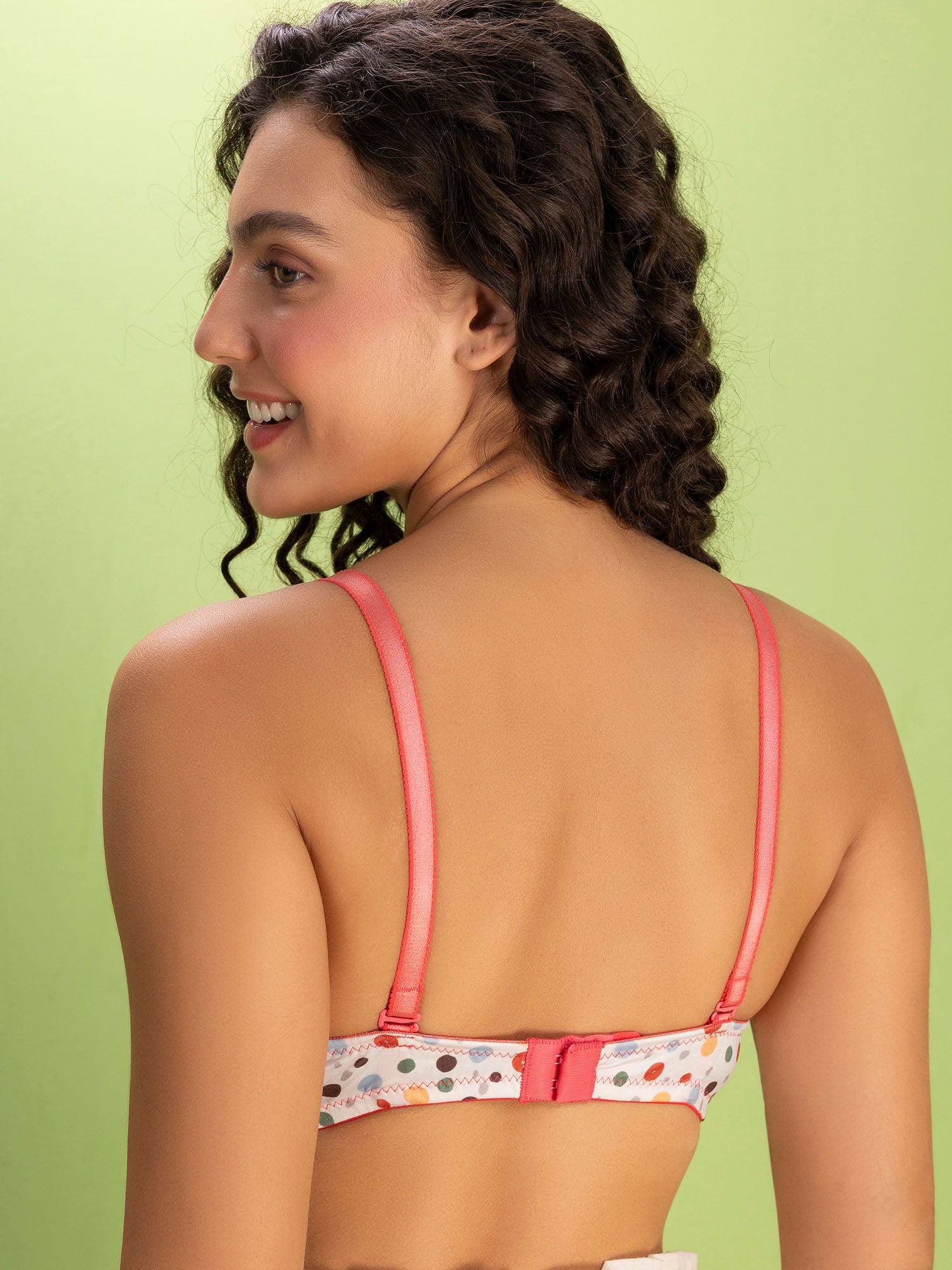 Slip into easy comfort with this padded, non-wired T-shirt bra designed for smooth shaping and everyday wear. The full-cup silhouette gives you secure coverage, while the soft padding keeps the look seamless under fitted tops. It features asymmetic polka and a bow at the center front for a touch of charm. The straight-back design comes with detachable, multiway straps so you can style it your way, whether that’s classic, cross-back, halter, or strapless support.